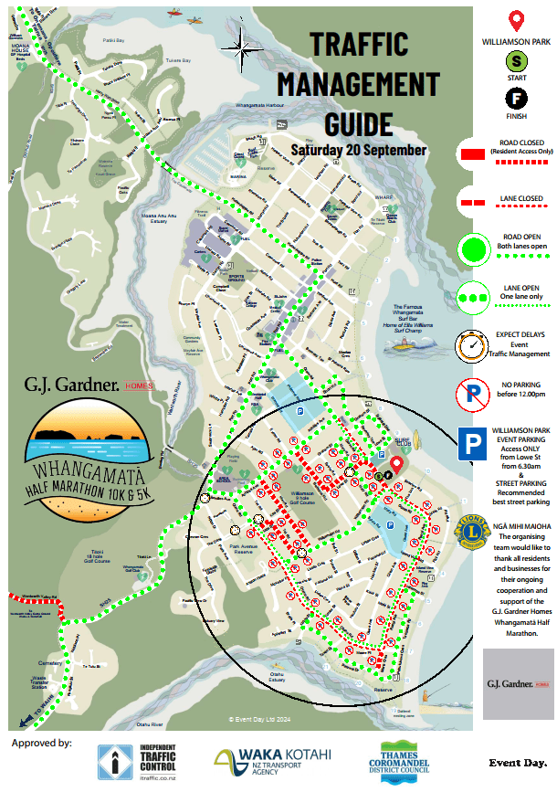 Temporary Traffic Management will be in place on the morning of the event. We encourage all visitors to Whangamatā and Whangamatā residents to review the guide below which highlights the areas of traffic management which may impact you.